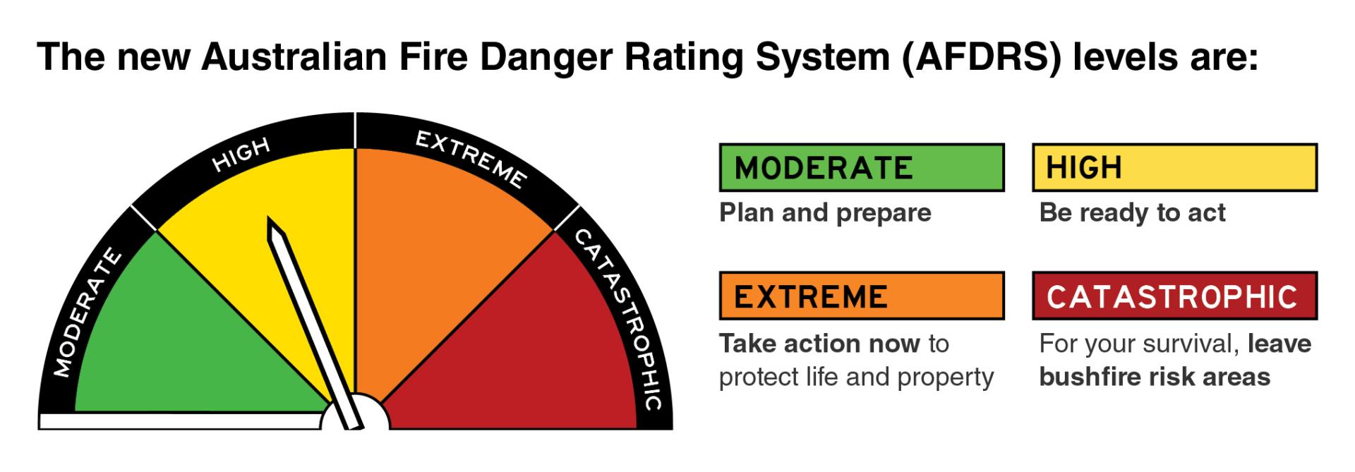 The Fire Danger Rating system tells you how dangerous a fire would be if one started. The Australian Fire Danger Ratings levels are: